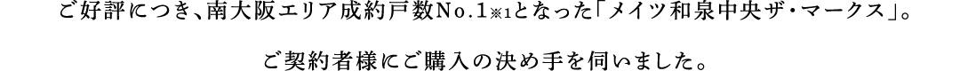 ※1.「メイツ和泉中央ザ・マークス」は南大阪(大和川以南)の新築分譲マンションにおいて2023年4月~11月発売物件の『期間成約戸数No.1』となります。(2023.12.MRC調べ)