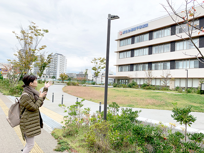 まず、「ららぽーと湘南平塚」の目の前には大きな総合病院がありました!病院の前は広場になっており、散歩コースとしても使えそう!
