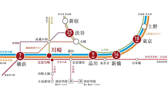 「ブランシエラ川崎大島」の最寄り駅であるJR「川崎」駅からは、東海道本線を利用してJR「東京」駅へ直通18分、JR「横浜」駅へ直通7分!通勤や通学に便利な場所です。