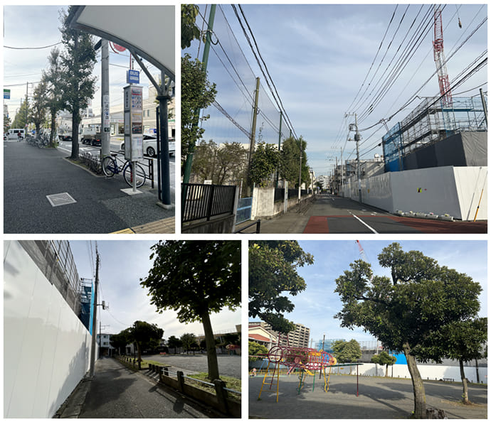 バスに乗ったら約15分で「ブランシエラ川崎大島」最寄りのバス停に到着しました。歩道も整備されており、坂道がないため歩きやすいです。大通りから一歩入った静かな落ち着いた環境の一角に工事中の「ブランシエラ川崎大島」が見えました。道路を挟んで目の前が小学校と公園で、公園の前には保育園もありました。子育て世代にはとても魅力的な環境です。