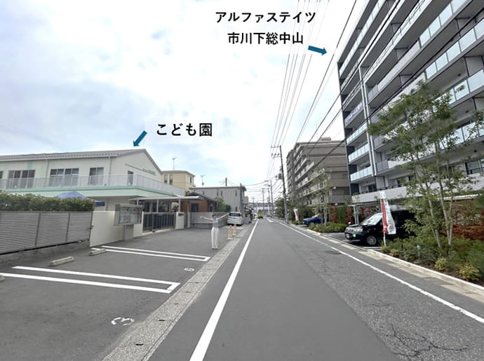 お店を見ながら歩いていると「アルファステイツ市川下総中山」に着きました。とても静かでゆったりとした環境です。駅から歩いてくる道のりも車通りが少なかったです。そしてマンションの目の前に幼保連携型のこども園があります!!共働きファミリーには魅力的!園庭の広さに驚きです。しかもこの子ども園のおかげでマンションの前には高い建物がなく、抜け感や明るさが感じられます。空が広い!