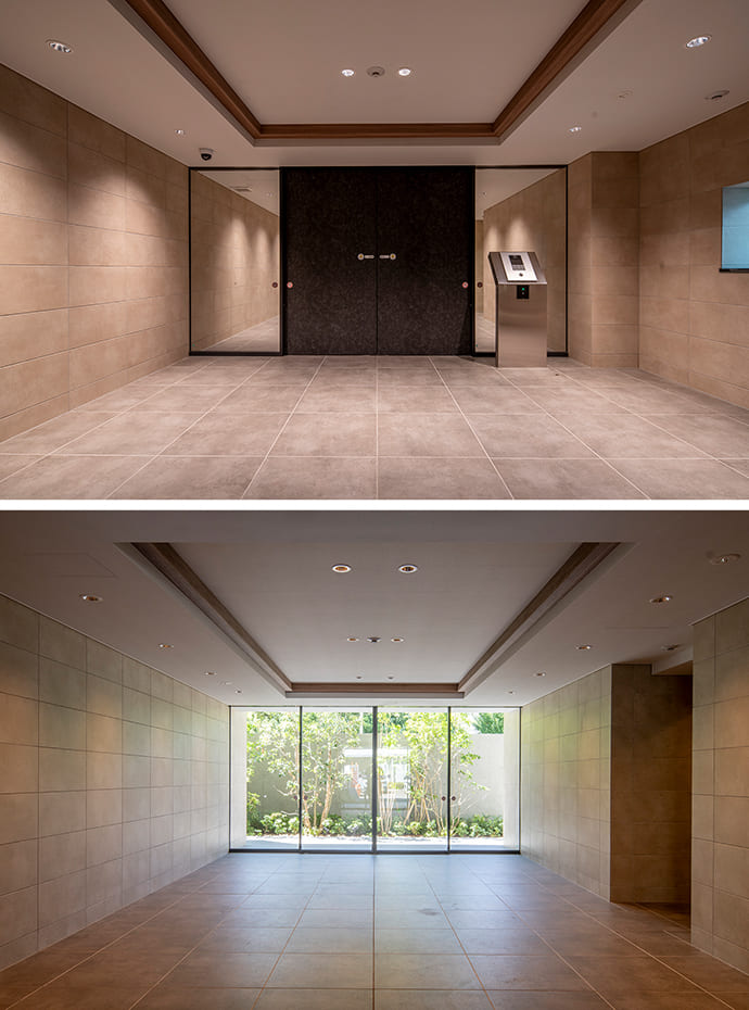 マンションの中に入ると落ち着いたエントランスホールの先に緑が見えて