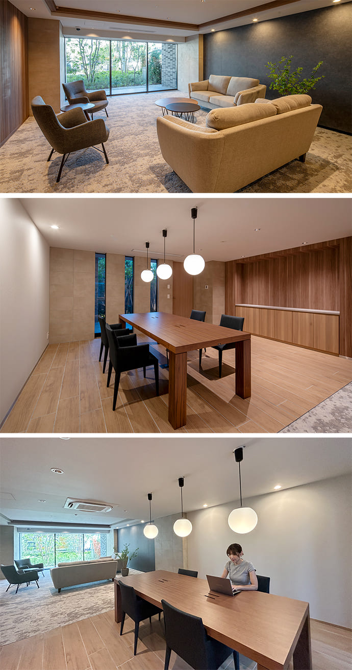 山田が魅力的に感じたのは、エントランスホールの隣にあるおしゃれなラウンジです!コンセントがついているテーブルもあり、在宅ワーク、子どもの学習、お友達と過ごす時間など、あると便利ですよね。私も今日の取材であった出来事を忘れないように少し使わせていただきました!(※1)
