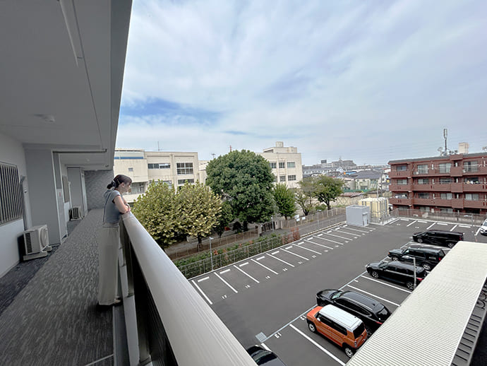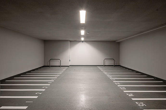 エレベータに乗ろうと思って、ふと廊下側に圧迫感が無いな、と思ってみてみたら、なんと、平置きの駐車場!!「アルファステイツ市川下総中山」全戸平置き駐車場なのも魅力の1つ!また、平置き駐車場のおかげで廊下側も空間が開いており、明るさと開放感があったんですね。ちなみに「アルファステイツ市川下総中山」から市川I.Cへは車で11分とカーアクセスも快適です。駐輪場も1段でした!(※2)