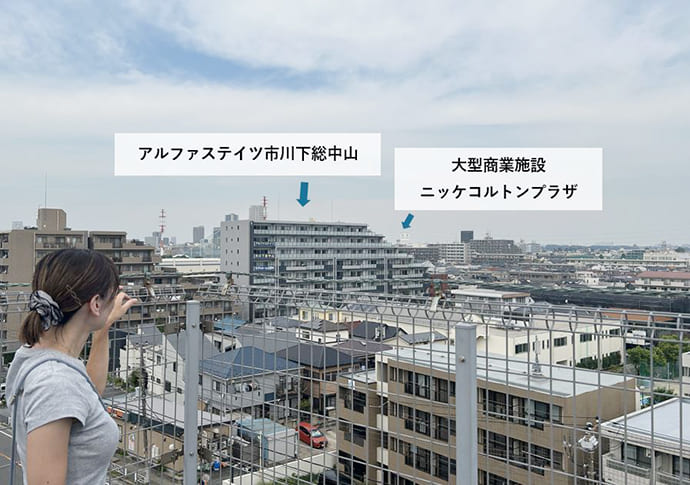 商業施設からも「アルファステイツ市川下総中山」が見えますね。近さを実感します。そして「アルファステイツ市川下総中山」の後ろ側に別の大型商業施設が見えました!後で行ってみようと思います。