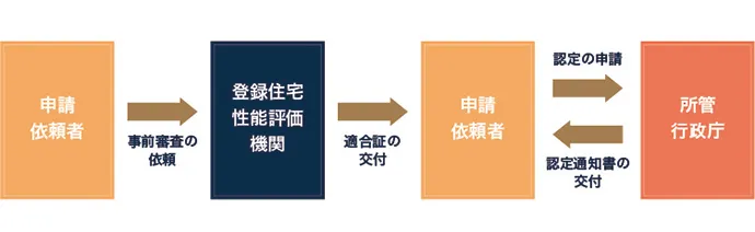 登録住宅性能評価機関からの確認書等の交付後、確認書を添付して、認定申請書・各種図面・計算書・添付図書一覧などの必要書類を所管行政庁へ提出、申請します。