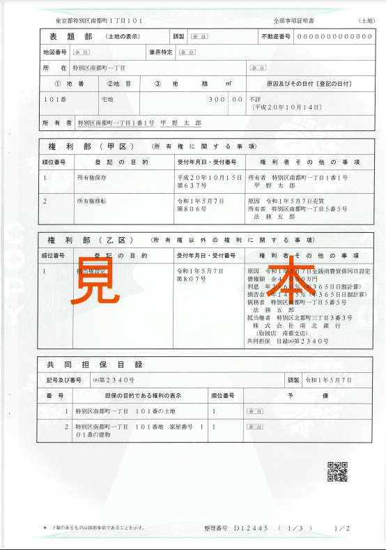| 権利部(甲区) | ・所有者の氏名、住所、不動産を取得した日付、原因(売買、相続など) (住宅ローンの支払いが滞り差し押さえを受けた場合はその旨を記載する) |