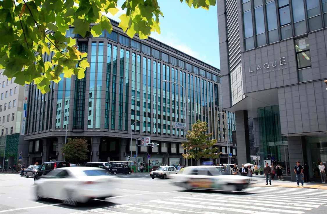 歴史を積み重ね成熟した街に、さらなる重厚感を与える茶を基調としたカラーリング。そこに、際⽴つホワイトのマリオンとスラブラインの交差が、端正なフォルムに凛とした表情を際⽴たせるデザインです。