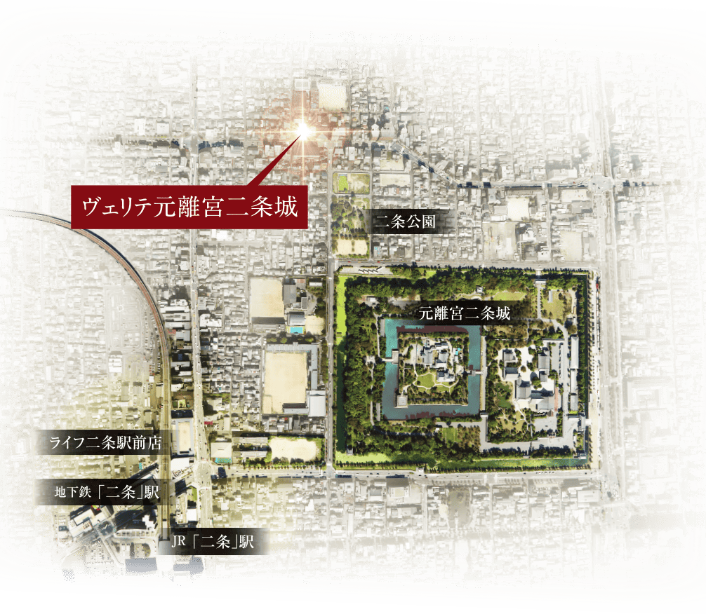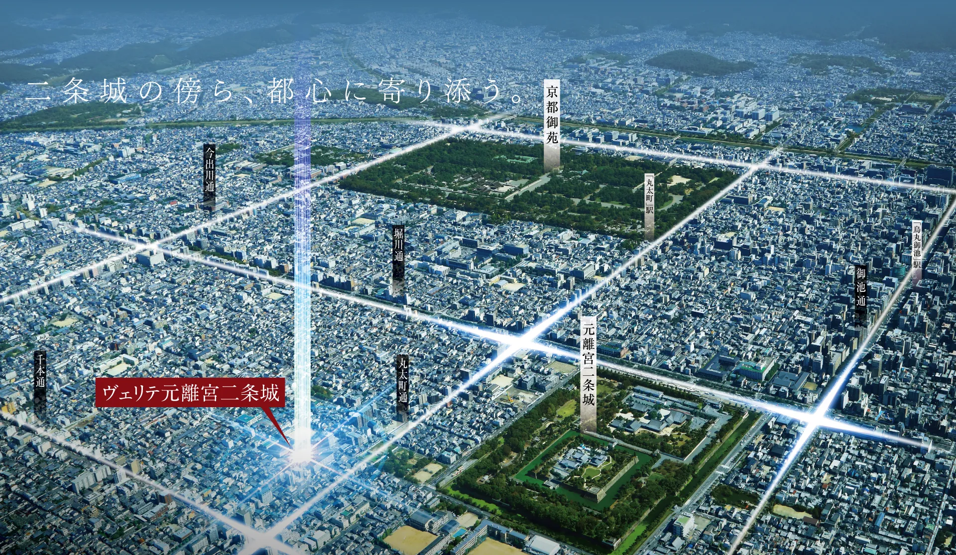 千⼆百年余りの歴史を重ねる京の中⼼・平安京。ここは、その平安京の要である⼤内裏が置かれた場所であり、さらには、天下⼈豊⾂秀吉が築いた聚楽第を間近にするエリア。そんな歴史の記憶を紡ぐ揺るぎない価値を持つこの場所と、現代の都市⽣活の利便性が調和する良質な住環境を舞台に、千載⼀遇の要とも呼びたい全26邸のプライベートレジデンス、「ヴェリテ元離宮⼆条城」誕⽣。