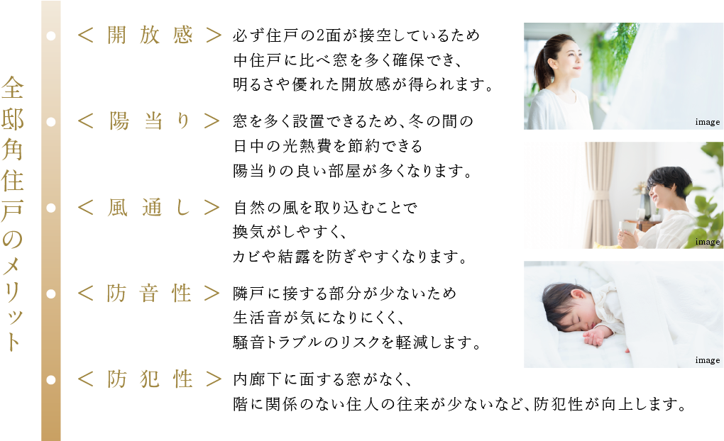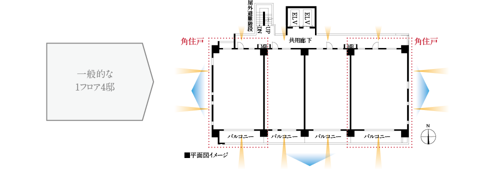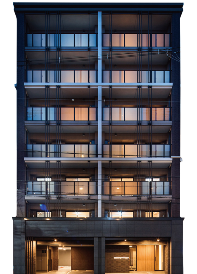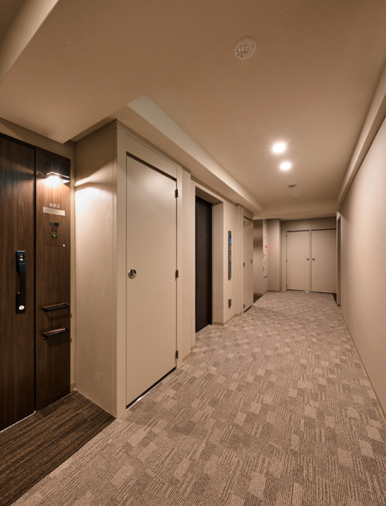 ここは、歴史と現代、閑静と躍動が寄り添うように佇む界隈。だからこそ、 外観デザインには、時を超えて美しい存在感を追求。 さらに、1フロア4邸(1階は2邸)により全邸角住戸配置を実現したほか、 プライベートレジデンスにふさわしいホテルライクな内廊下設計を採用しました。