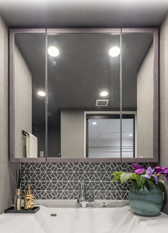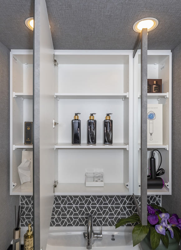 アプローチから⾵除室を抜けると、そこは、奥⾏きを感じさせ、住まいの品格を漂わせるエントランスホール。間接照明に浮き上がる折り上げ天井と、ダウンライトに照らされたタイル貼りのフロアが、やすらぎの懐深くへとエスコートしてくれます。