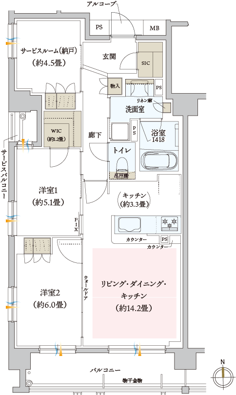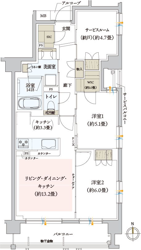 | サービスバルコニー面積 | 1.55㎡・1.70㎡ |