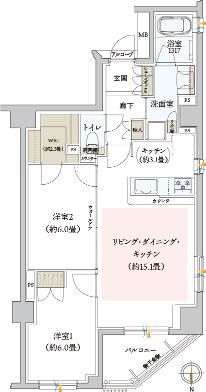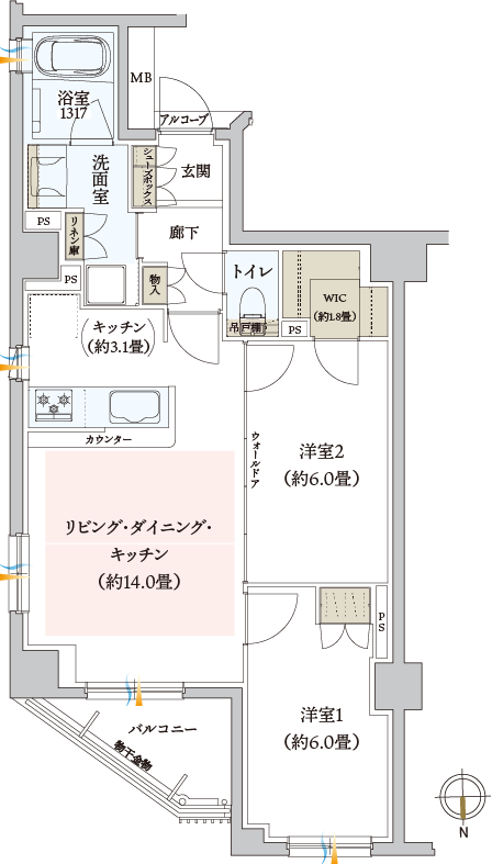 | 間取り | 2LDK+WIC~2LDK+S(納⼾)+2WIC |